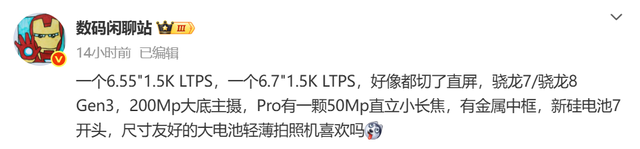 与此同时,博主@数码闲聊站 发文透露,“一个6.55"1.5K LTPS,一个6.7"1.5K LTPS,好像都切了直屏,骁龙7/骁龙8 Gen3,200Mp大底主摄,Pro有一颗50Mp直立小长焦,有金属中框,新硅电池7开头,尺寸友好的大电池轻薄拍照机喜欢吗”?