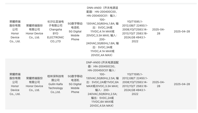 除了全新智能穿戴系列,日前,型号为DNN-AN00、DNP-AN00的两款新机通过了工信部无线电核准,分别配备80W和90W有线充电,消息称这两款新机分别对应荣耀400和荣耀400 Pro。